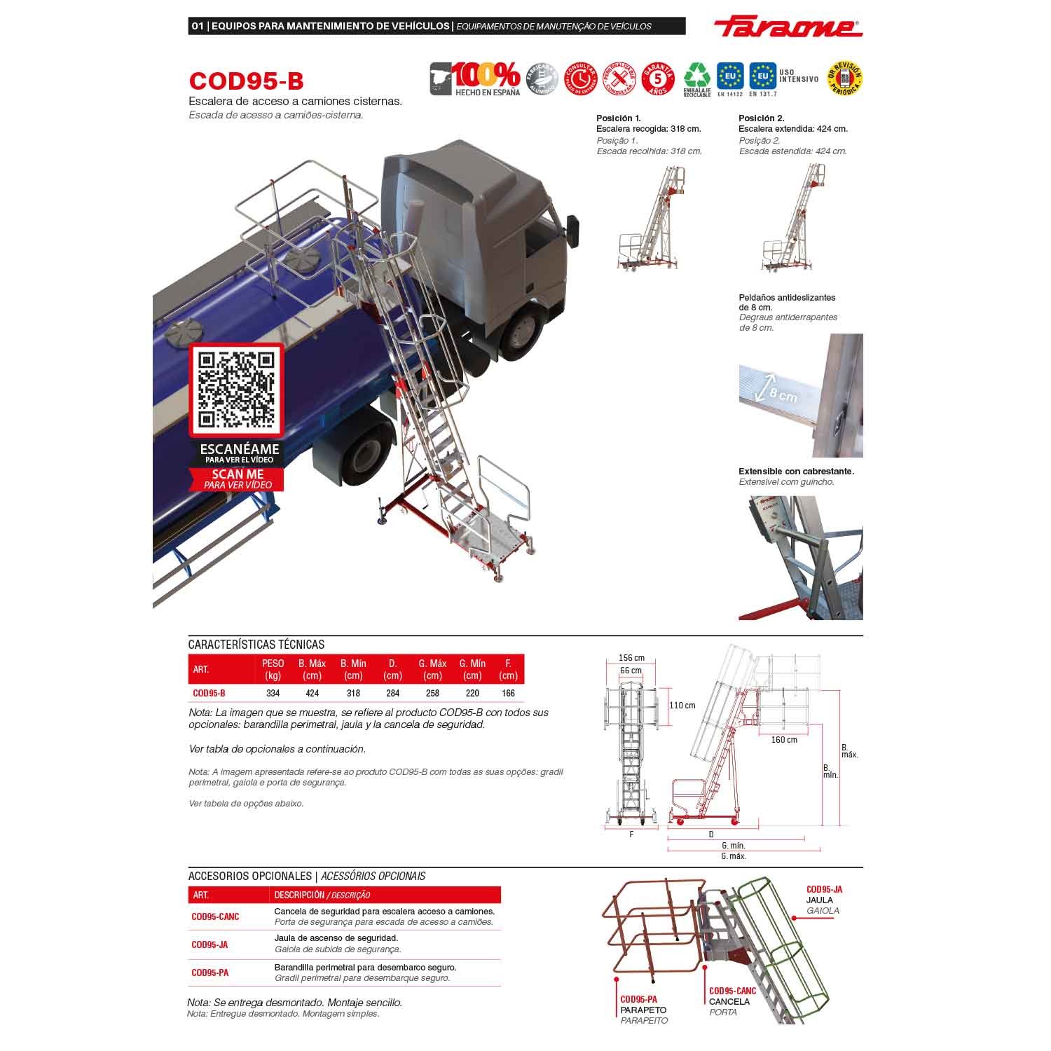 El COD95-B es una escalera regulable en altura, ideal para acceder de manera segura a techos de camiones cisterna, autobuses y camiones frigoríficos. Fabricada en aluminio, es ligera y resistente, con ruedas para fácil desplazamiento y frenos. Cumple con la normativa EN 131 y soporta hasta 150 kg, siendo perfecta para industrias petroquímicas.