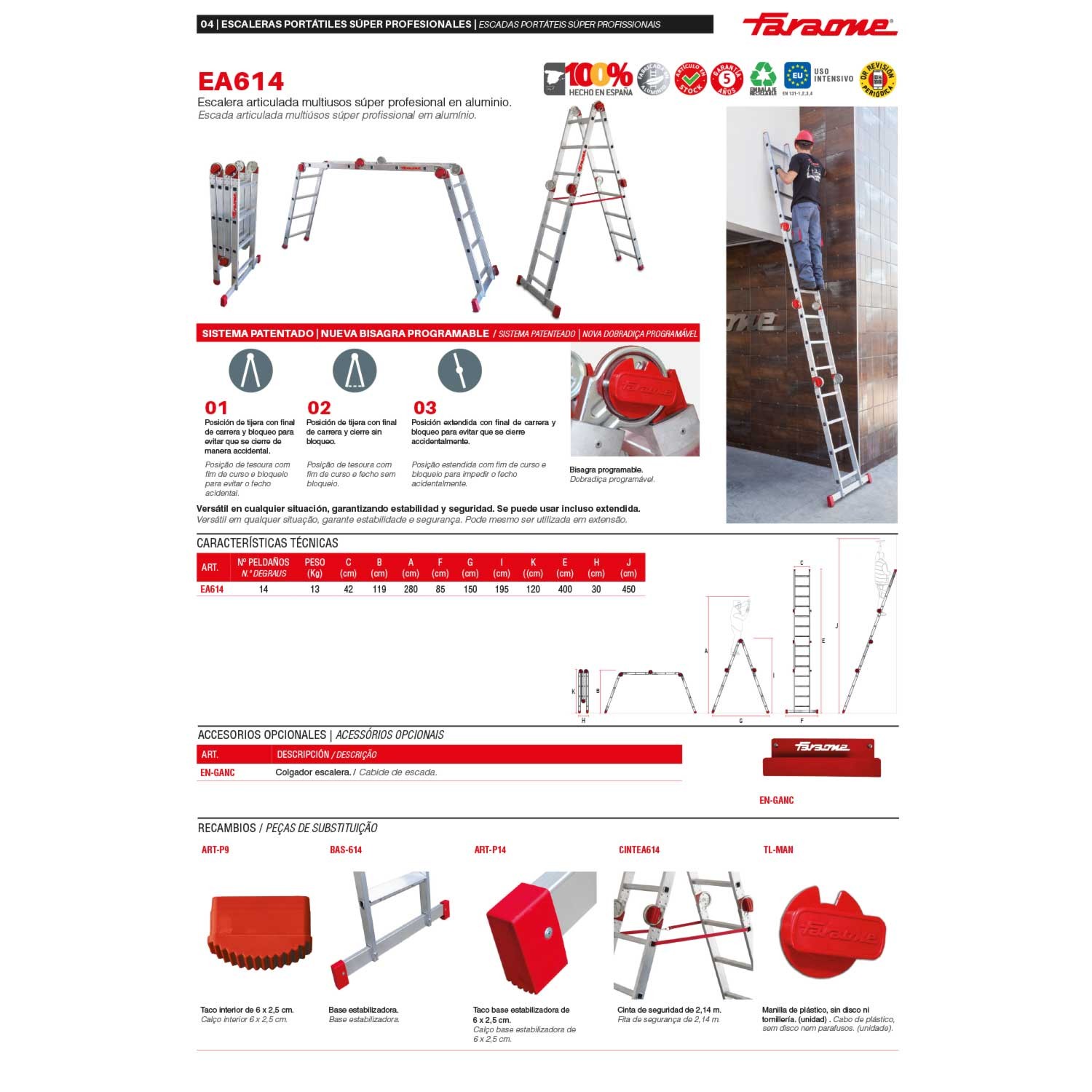 La escalera EA614 está fabricada en aluminio y diseñada para trabajar en tres posiciones distintas: en tijera, extendida y en modo plataforma.