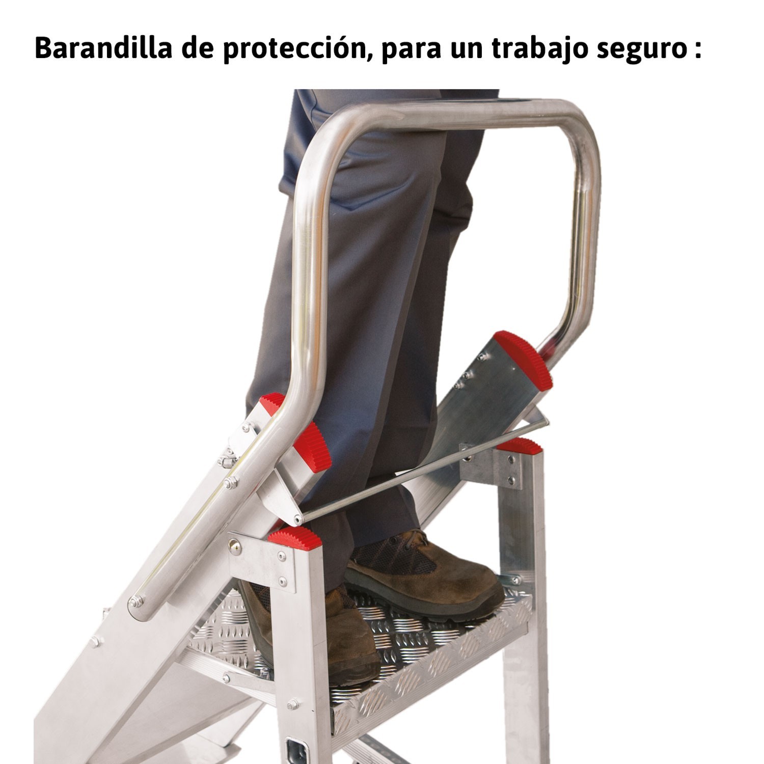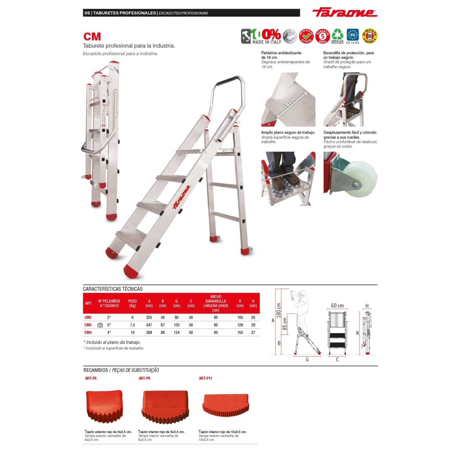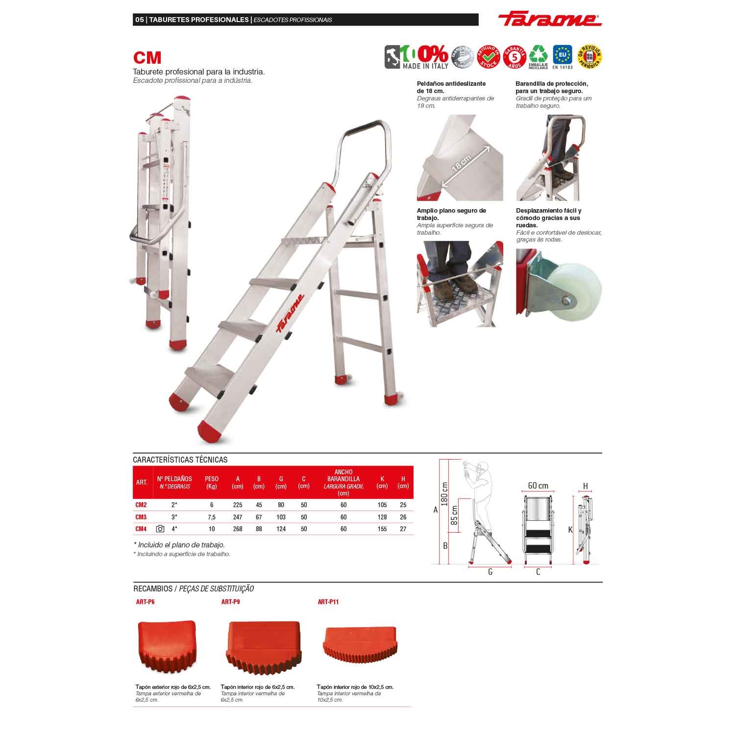El CM es un taburete de aluminio fabricado con peldaños antideslizantes de 18 cm para garantizar la estabilidad y la seguridad durante el uso.