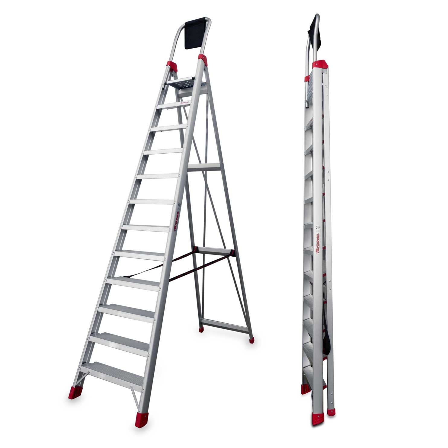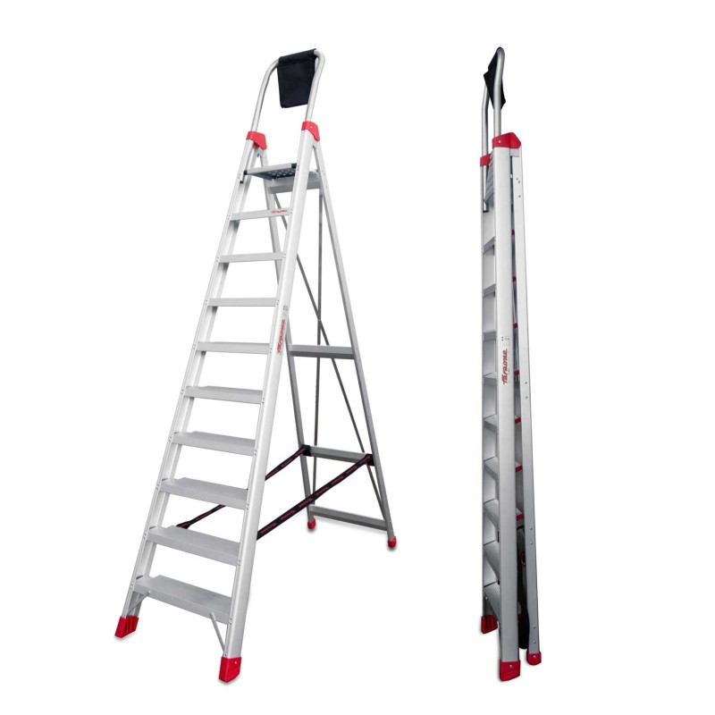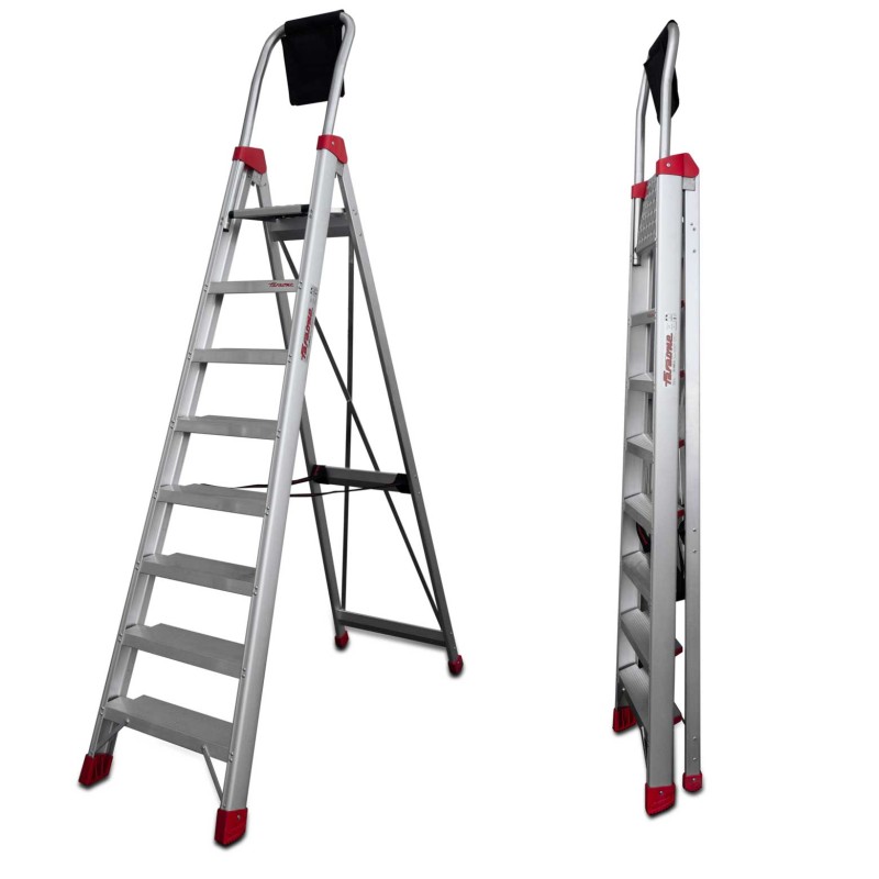 La escalera DOMUS está fabricada en aluminio con montantes especiales tipo C para acoplar peldaños de 130 mm de ancho y ruedas retráctiles para facilitar el desplazamiento.