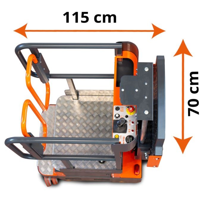 Es muy fácil de maniobrar gracias a su cómodo joystick, que permite conducir con una sola mano. Además, gracias al radio de viraje cero, la plataforma gira 360°, lo que simplifica el movimiento incluso en los lugares más difíciles.