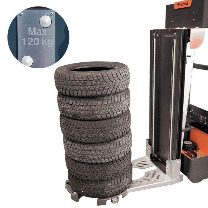 Esta máquina permite optimizar los tiempos y minimizar el esfuerzo: la herramienta permite levantar los neumáticos directamente desde el suelo y regular de forma eléctrica la longitud de la carrera para acercar o alejar los neumáticos del operador.