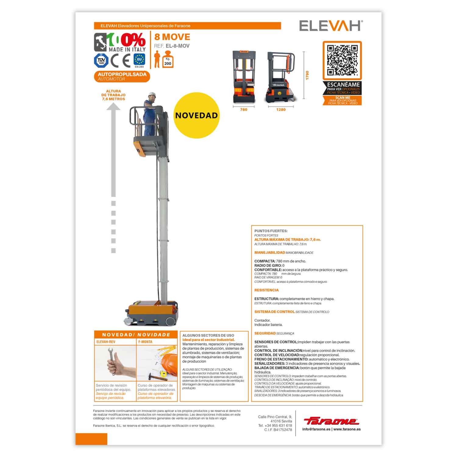 La Elevah 8 Move es una plataforma autopropulsada compacta de nueva generación, diseñada para garantizar la máxima seguridad, robustez y facilidad de uso. Con una altura máxima de trabajo de 7,6 metros.