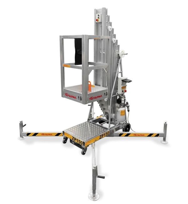 La Elevah ZP 150 es una plataforma de tracción manual y elevación eléctrica que, según la configuración elegida, puede alcanzar diferentes alturas de trabajo, desde un mínimo de 7,7 m hasta un máximo de 16 m. También puedes elegir entre uso interno o externo.