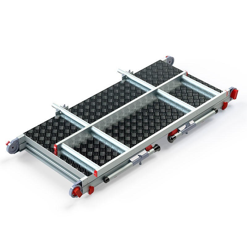 Plataforma telescópica con pies regulables en altura para absorción de desniveles y práctica barandilla abatible.