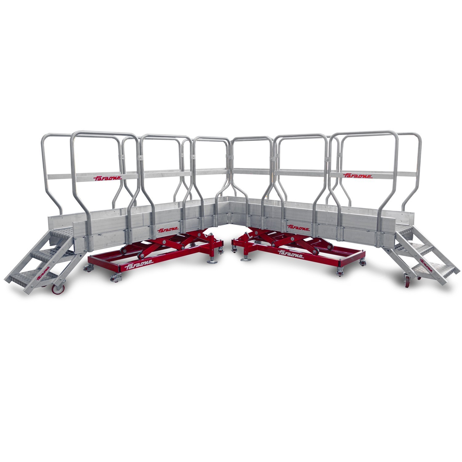 Plataformas simples, dobles y regulables en altura accionadas por cabrestante. Escaleras de acceso frontal y lateral con cómodos peldaños antideslizantes. Elementos de seguridad como barandillas, cancelas, bases estabilizadoras, estabilizadores, parapetos, etc.