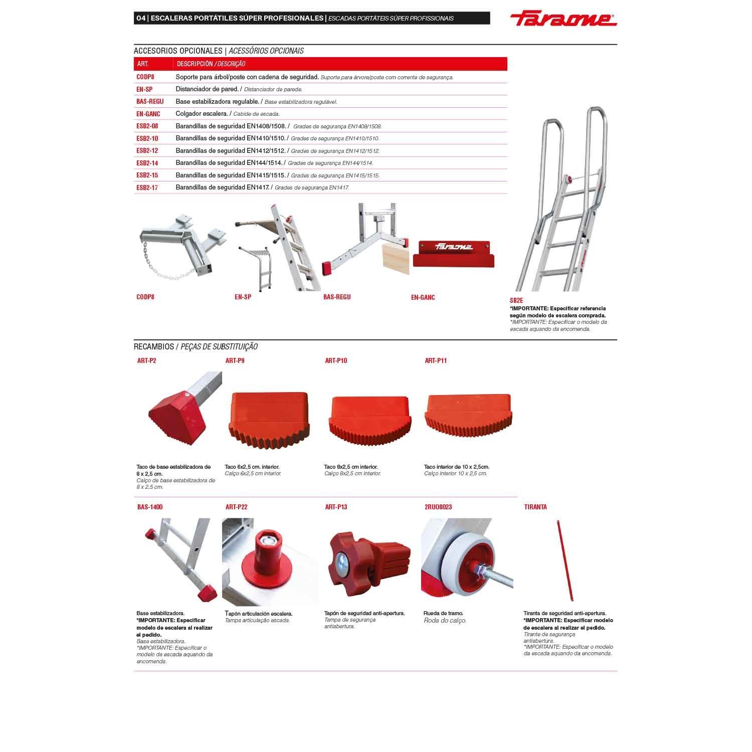 Dispone de dos ruedas en el extremo para facilitar la extensión a pared, bisagra robusta que permite de nivelar el tramo para trabajar en desnivel y un bloqueo de seguridad mediante un gancho con muelle práctico y seguro.
