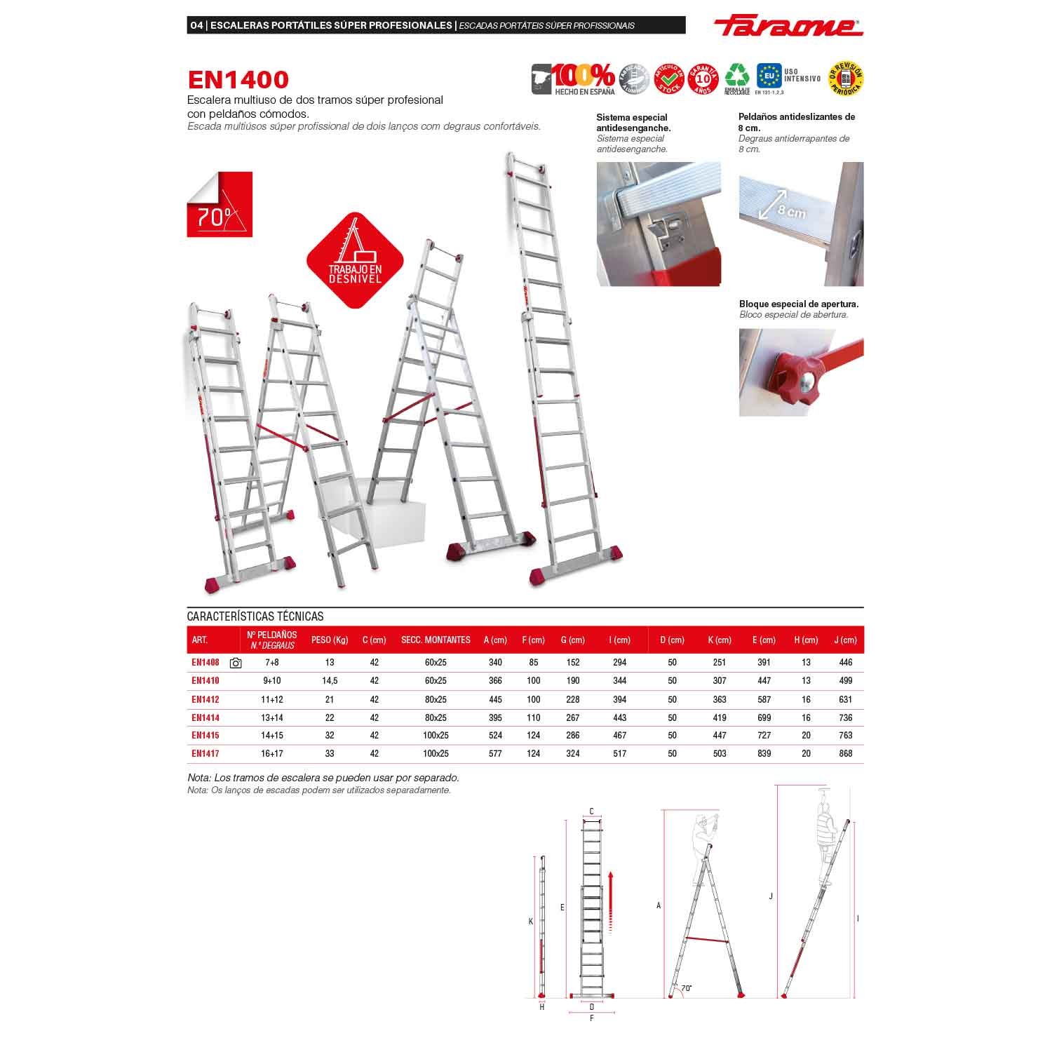 Al ser una escalera multiusos combinada, se puede utilizar como escalera de tijera de doble subida. Los dos tramos se pueden extender y usar como escalera de apoyo a pared. También se puede poner en desnivel por lo que está indicada para realizar tareas en suelos como aceras o escaleras.