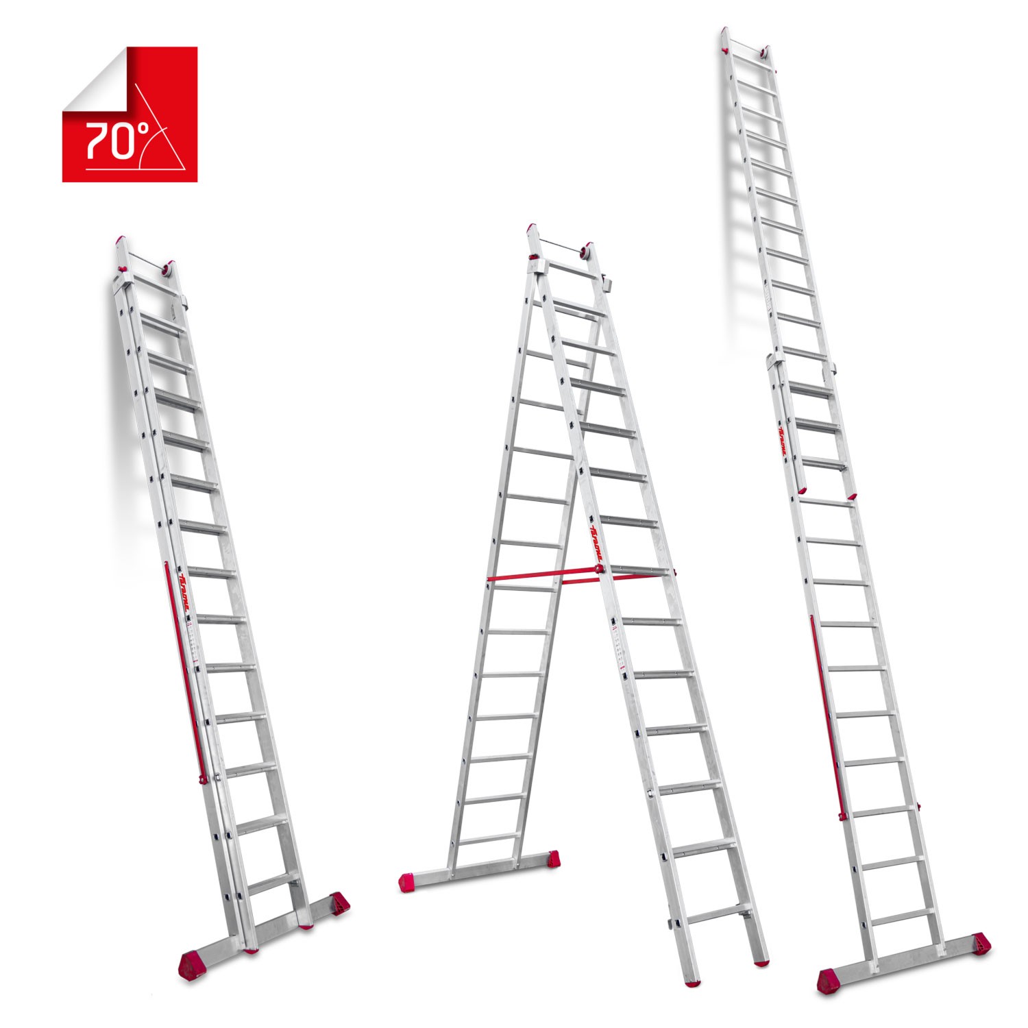 Al ser una escalera multiusos combinada, se puede utilizar como escalera de tijera de doble subida. Los dos tramos se pueden extender y usar como escalera de apoyo a pared. También se puede poner en desnivel por lo que está indicada para realizar tareas en suelos como aceras o escaleras.