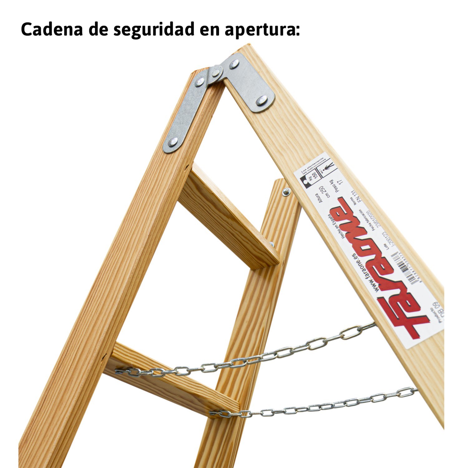 La escalera fabricada en madera, es autoestable, permite la subida por ambos lados y el sistema de bisagras de cierre/apertura es resistente, seguro y sencillo.