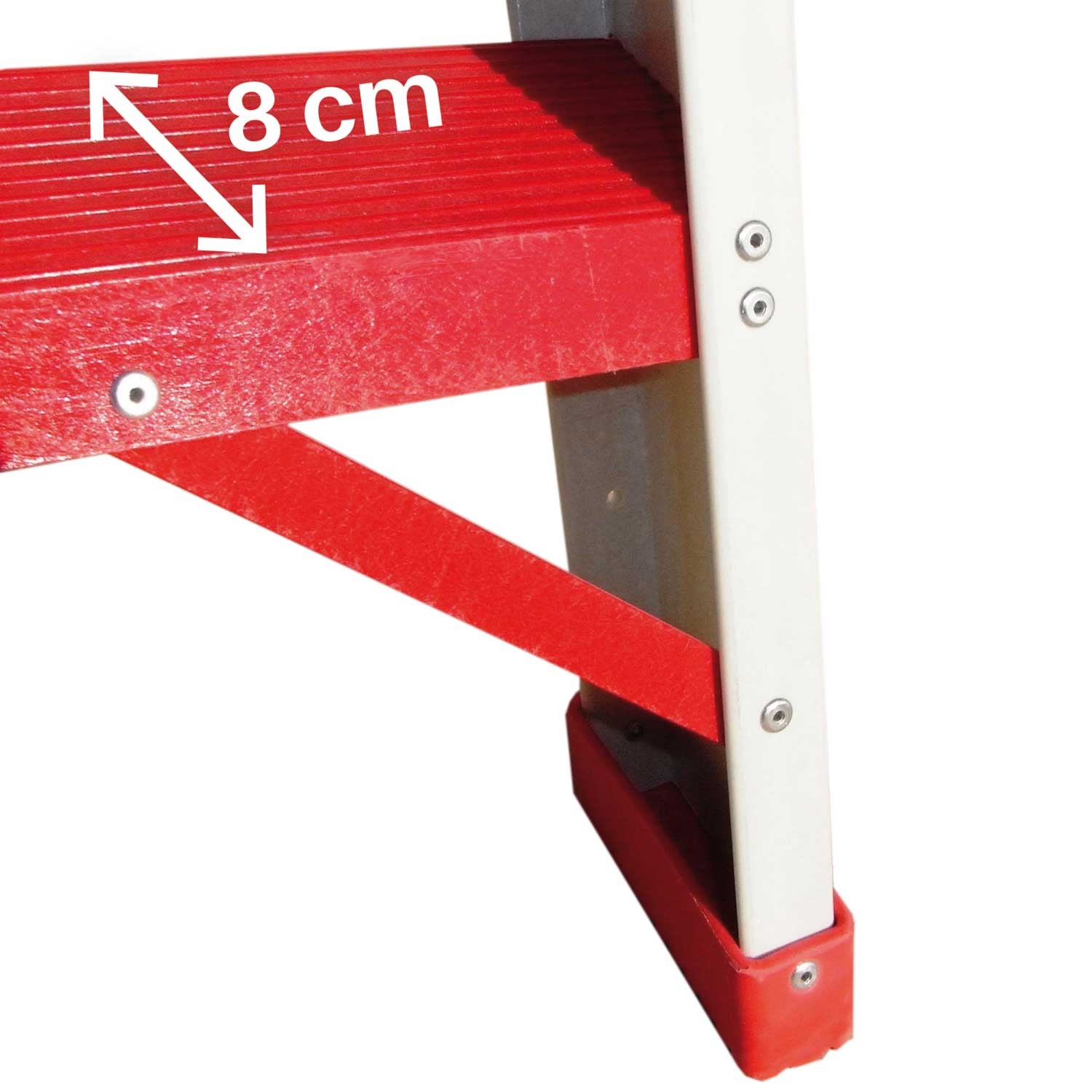 Escalera plegable con ruedas y amplio plano de trabajo antideslizante en tramex, totalmente fabricada en fibra de vidrio.