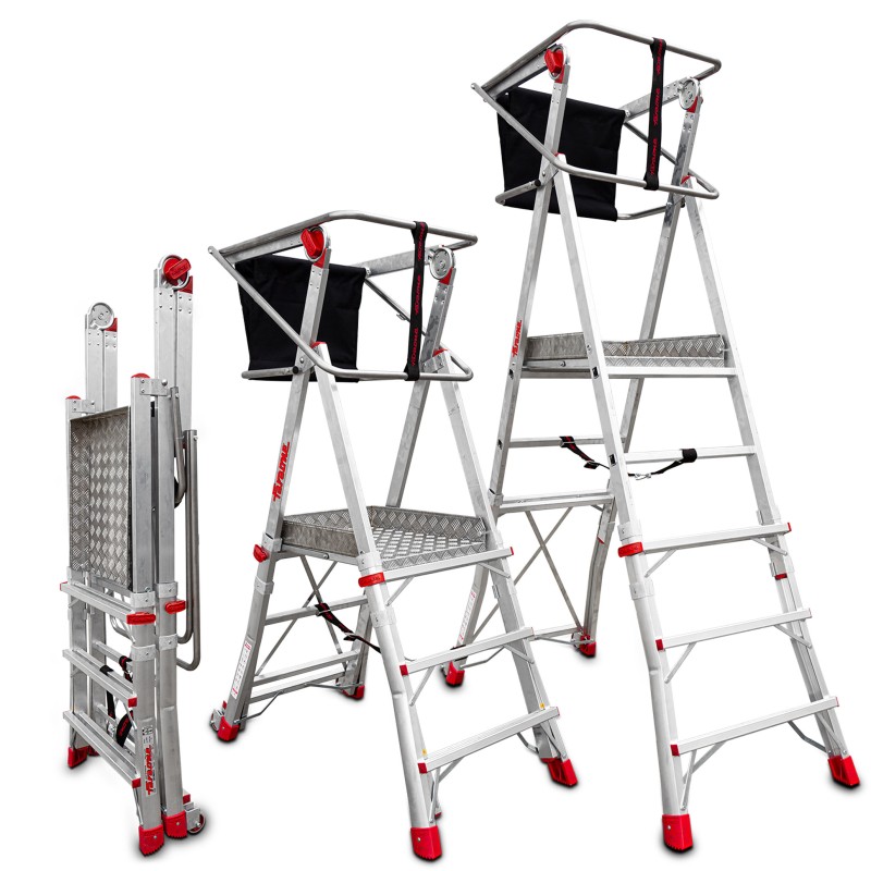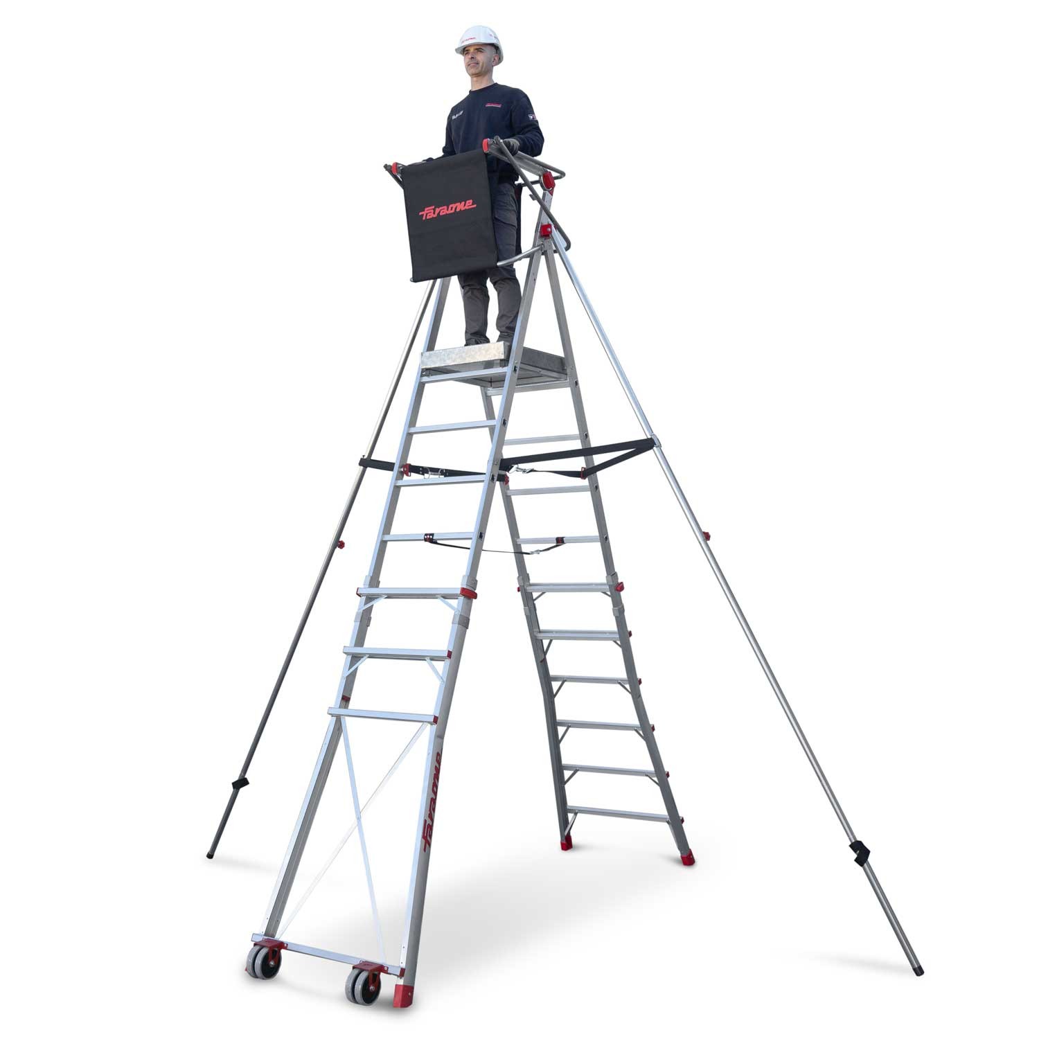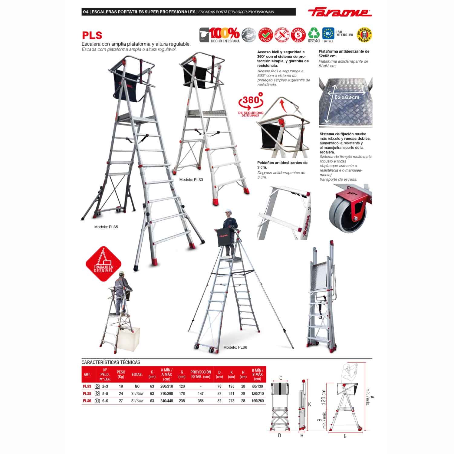 La PLS es una escalera plegable, regulable en altura, con ruedas dobles y amplio plano de trabajo antideslizante de 52x62 cm al que se accede mediante una escalera con peldaños antideslizantes de 3 cm de profundidad.