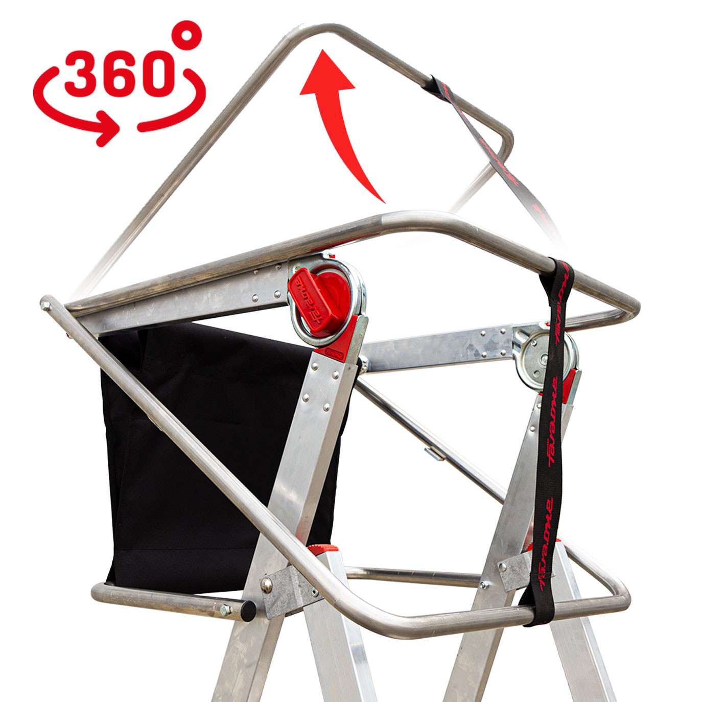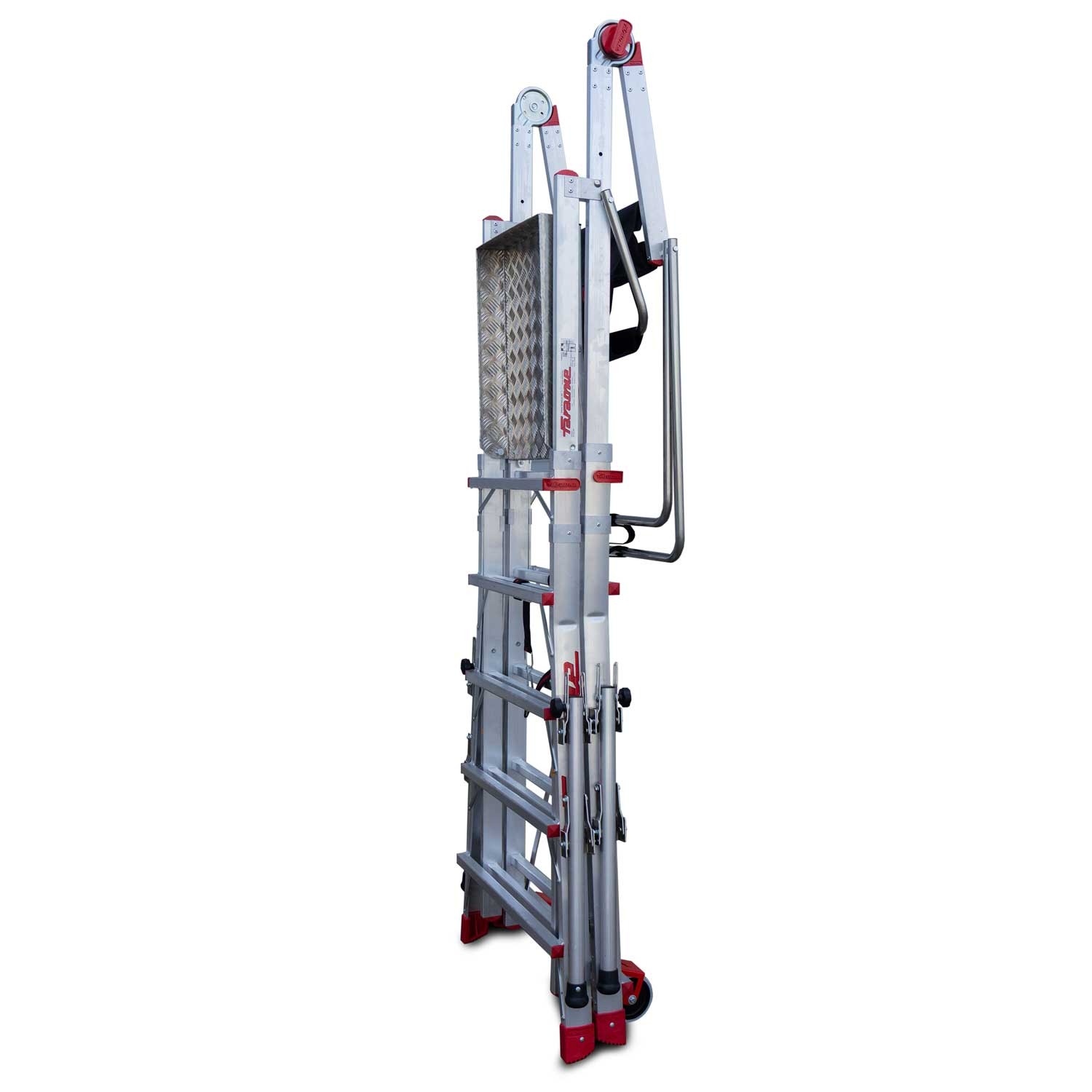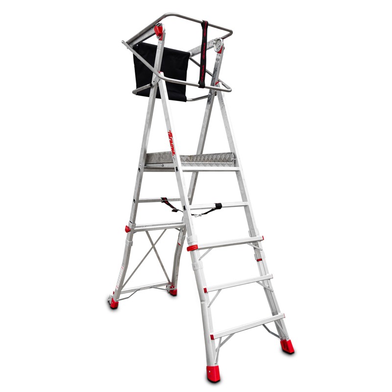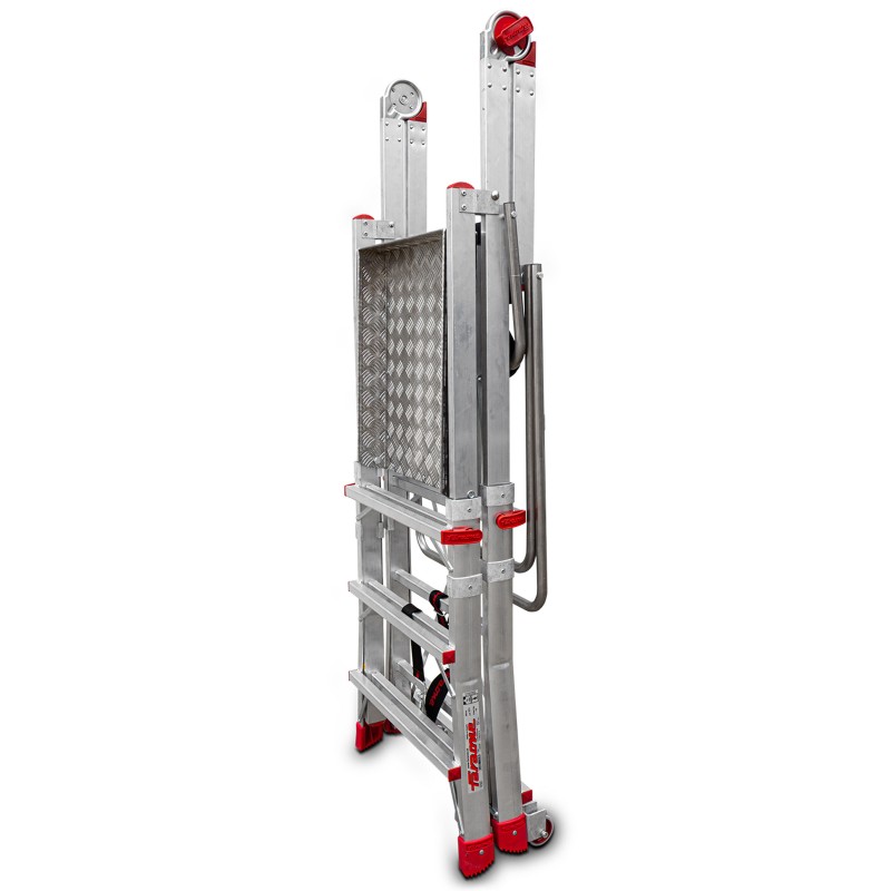 La PLS es una escalera plegable, regulable en altura, con ruedas dobles y amplio plano de trabajo antideslizante de 52x62 cm al que se accede mediante una escalera con peldaños antideslizantes de 3 cm de profundidad.