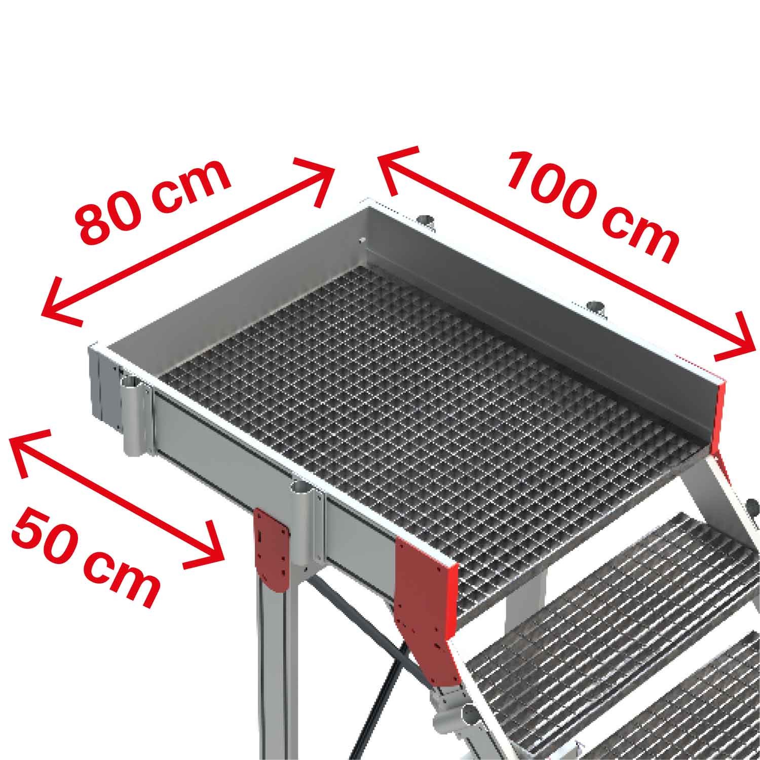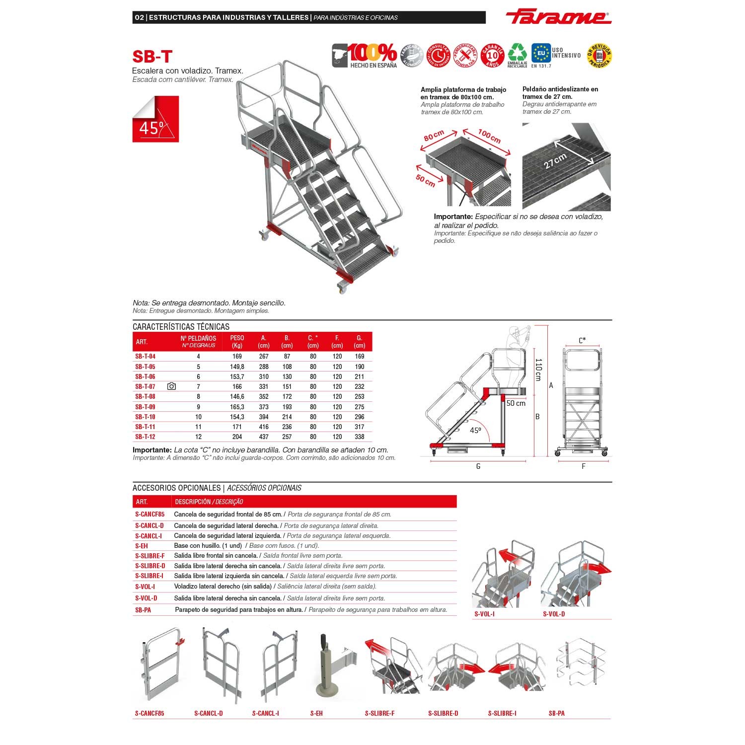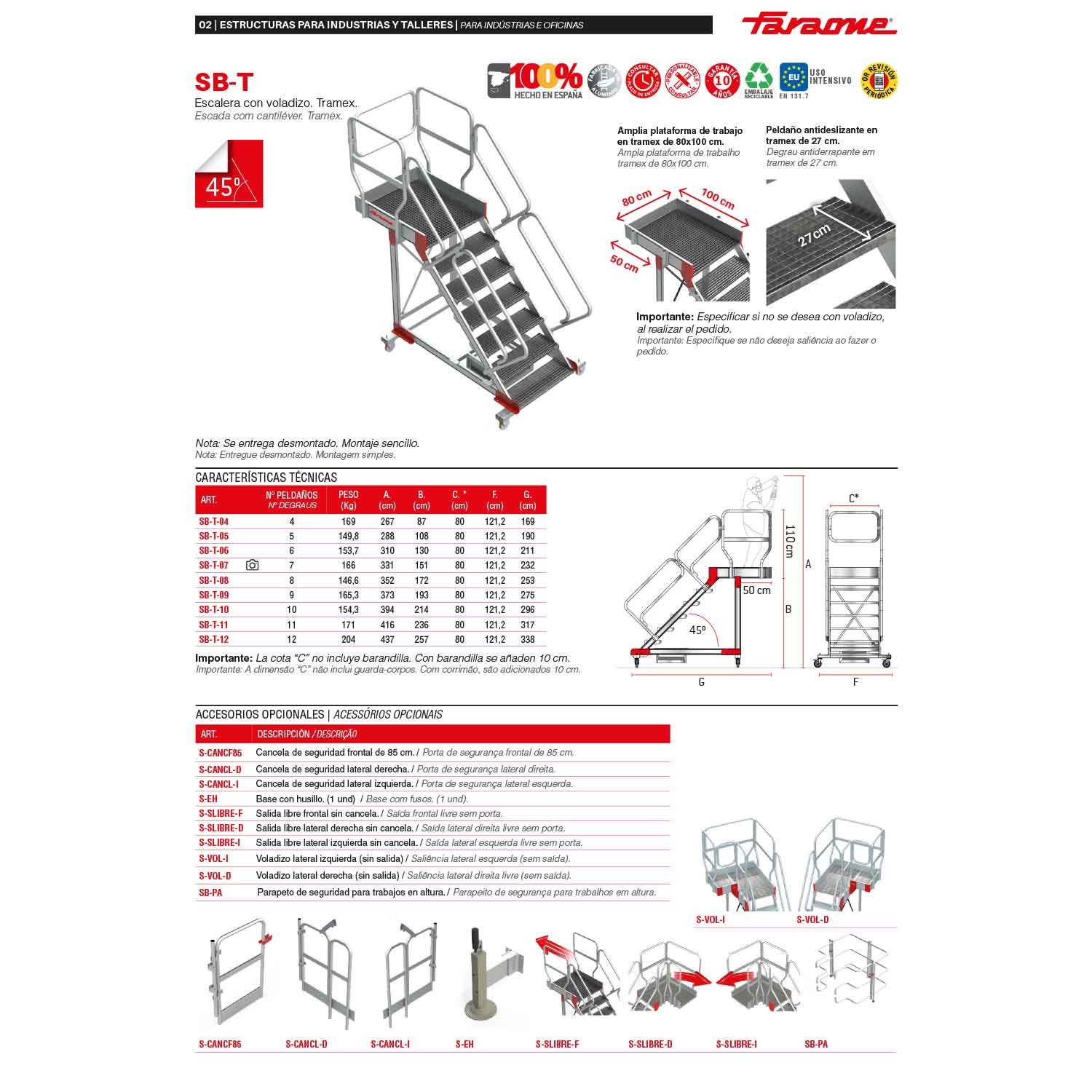 La SB-T es una escalera con ruedas y amplio plano de trabajo antideslizante de 85x100 cm con acceso mediante una escalera de 45º de inclinación con peldaños antideslizantes de 27 cm de profundidad y pasamanos en ambos lados. El plano de trabajo incluye zócalos de 24 cm de altura y barandillas de seguridad de 110 cm en los tres lados.