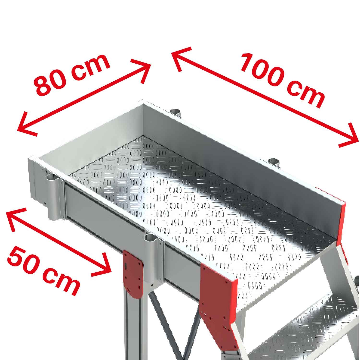Está diseñada para trabajar en altura en sitios donde hay obstáculos en el suelo, por eso se fabrica con vuelos de diferentes largos, siendo el máximo 50 cm. El plano de trabajo incluye zócalos de 15 cm de altura y barandillas de seguridad de 110 cm en 3 lados.