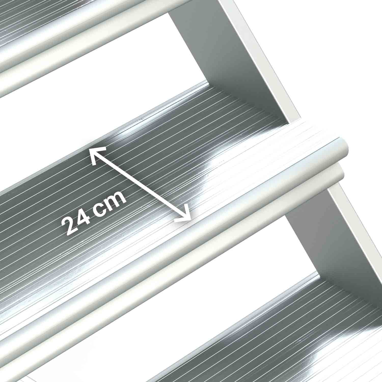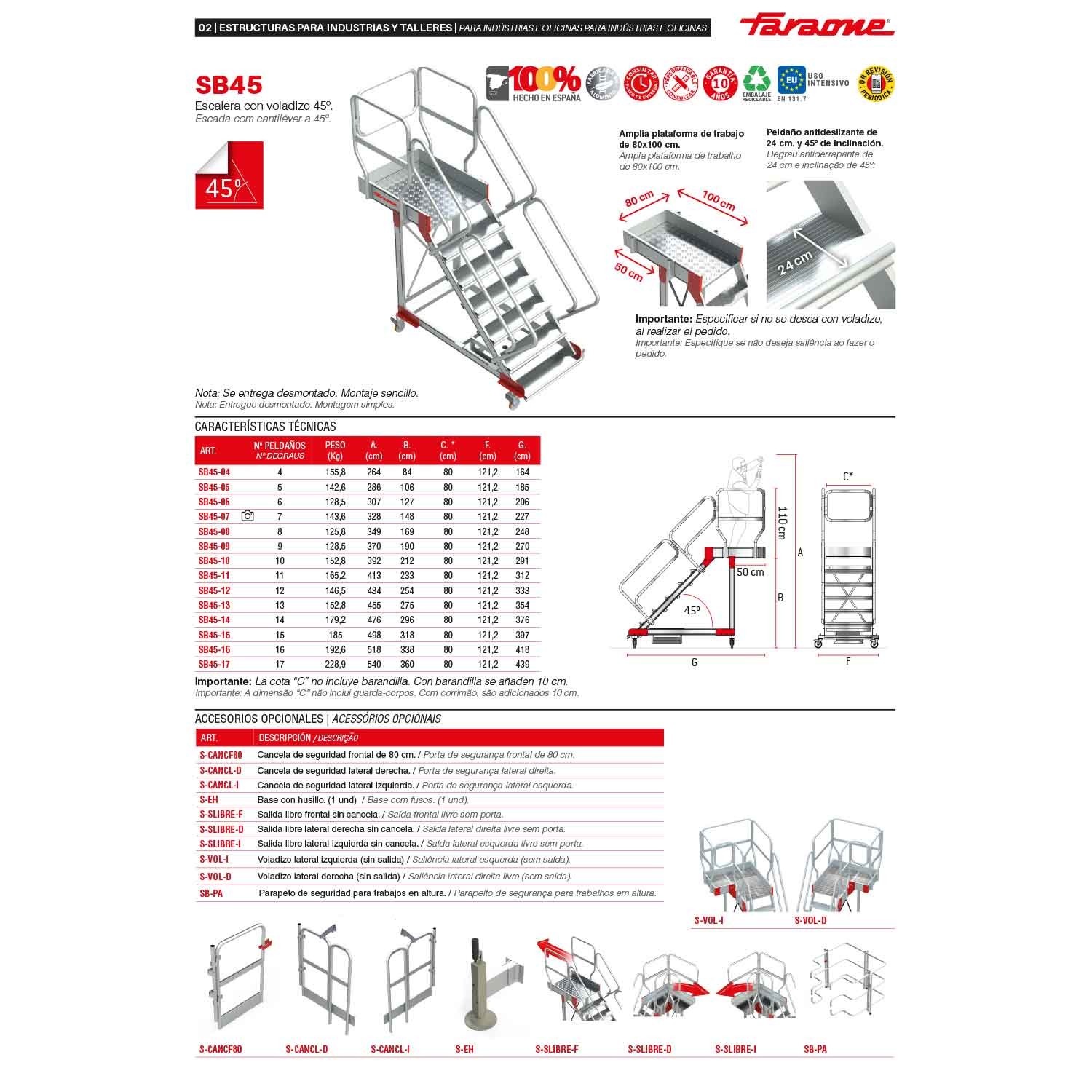 La SB45 es una escalera con vuelo y amplio plano de trabajo antideslizante con acceso mediante una escalera de 45º de inclinación con peldaños antideslizantes de 24 cm de profundidad y pasamanos en ambos lados.