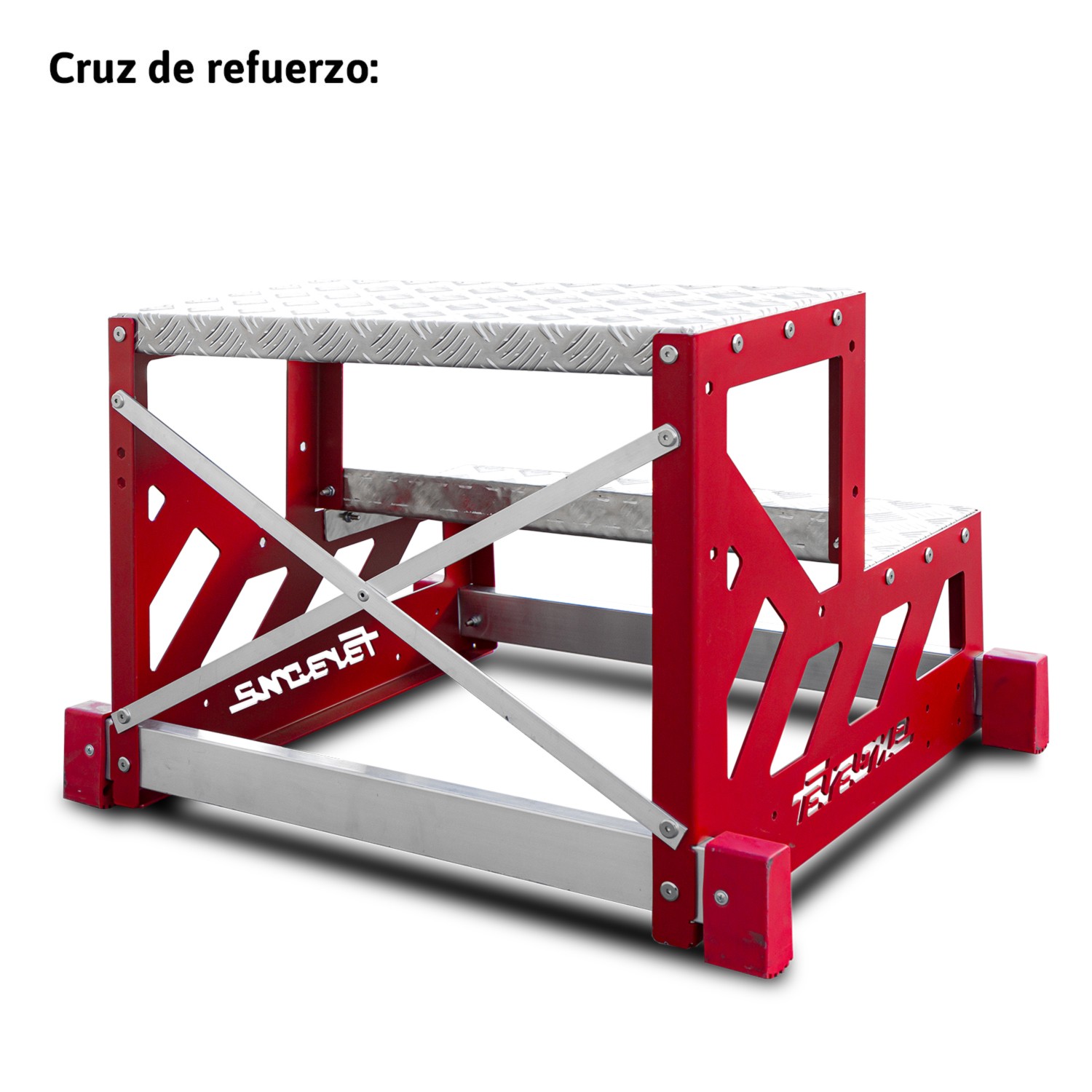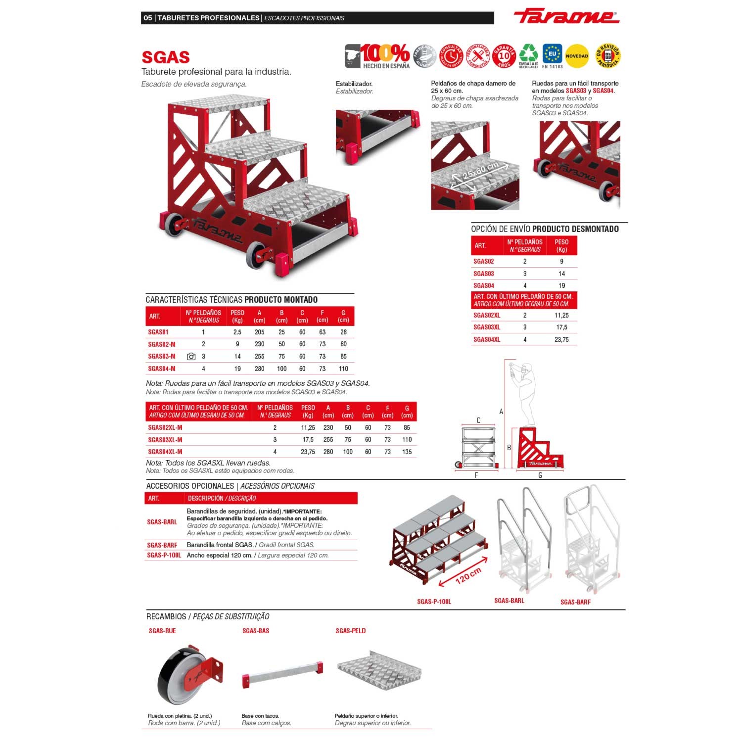 El SGAS es un taburete de aluminio fabricado con peldaños antideslizantes de 25x50 cm para dotar de estabilidad y seguridad durante el uso. Taburete tipo cúpula en el modelo de un peldaño y taburete tipo gradilla en el resto de modelos.