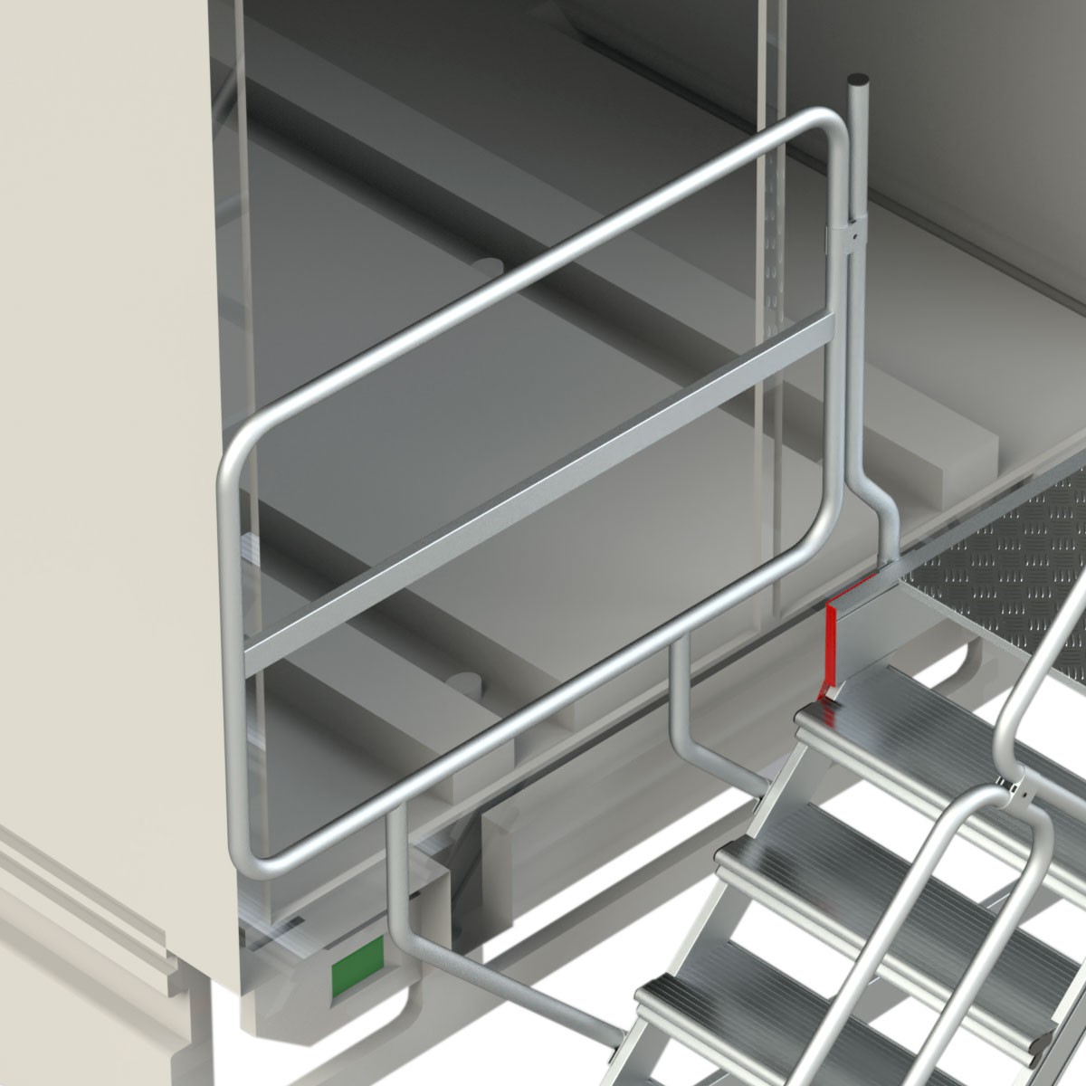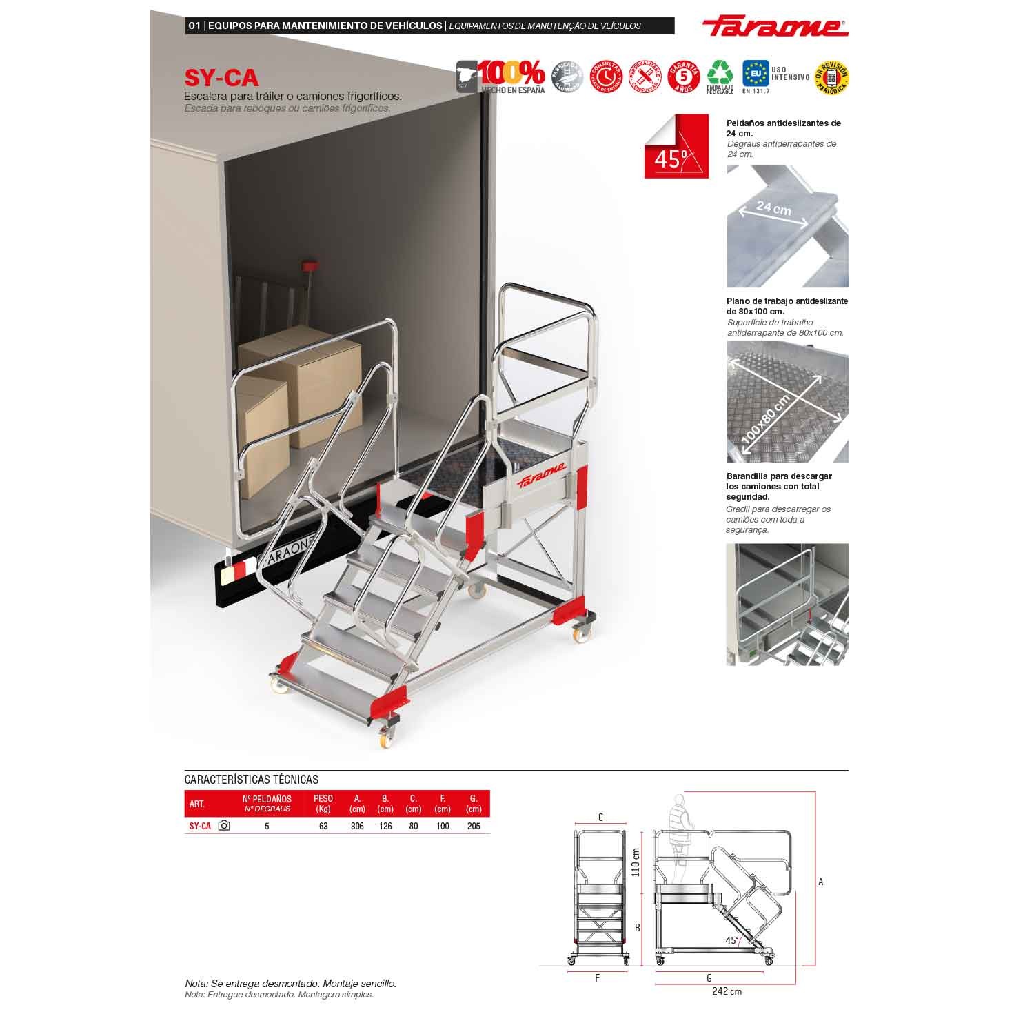 La SY-CA es un modelo de escalera estudiado para descargar y cargar los tráiler o camiones frigoríficos con total seguridad gracias a su barandilla de seguridad desmontable de 1100 mm de altura que evita que el operario se pueda caer del camión durante la operación.