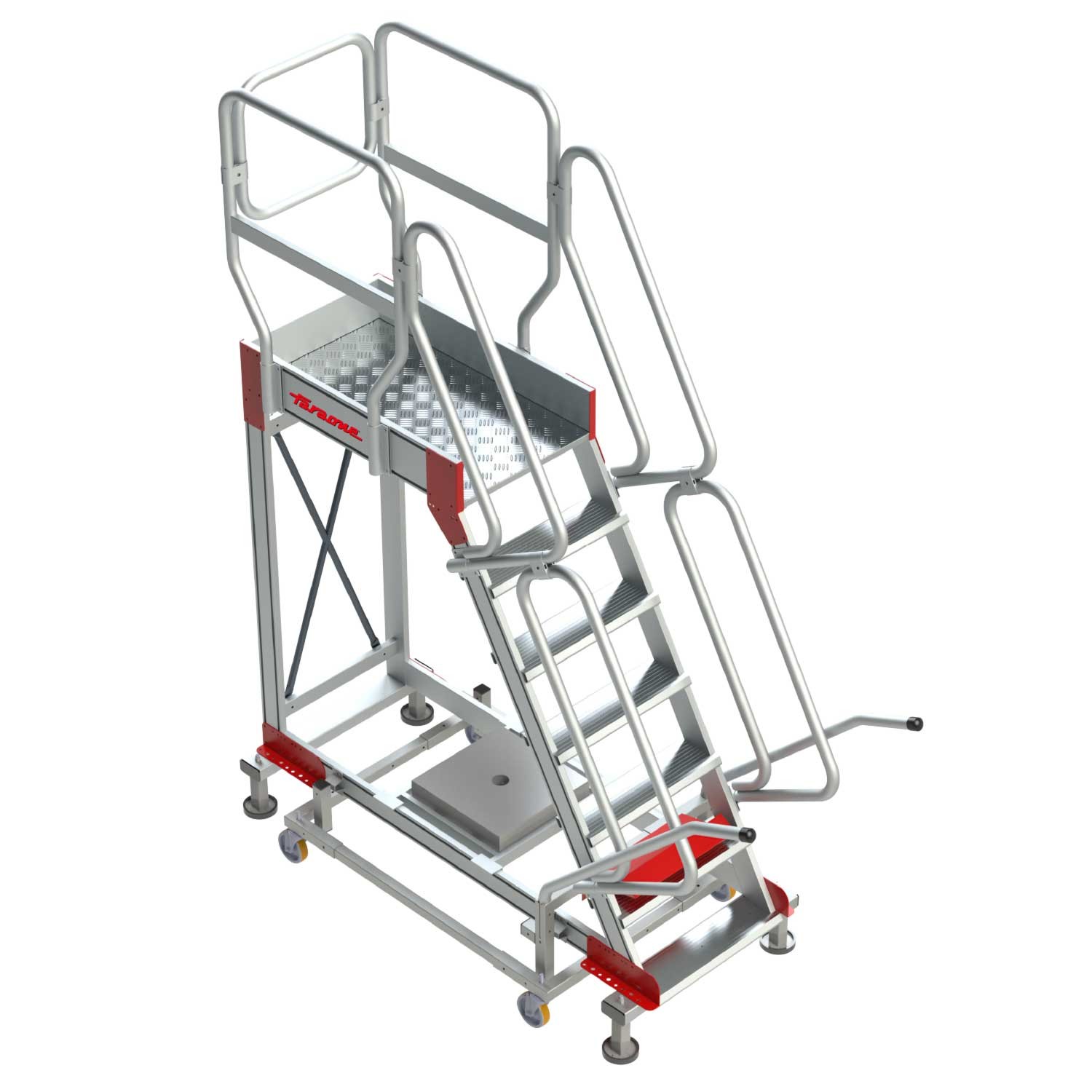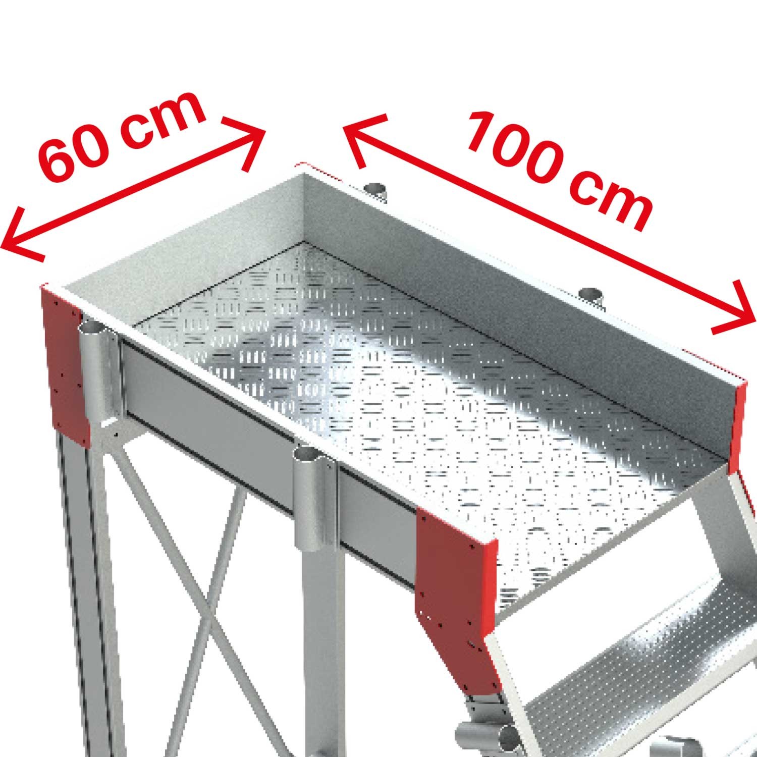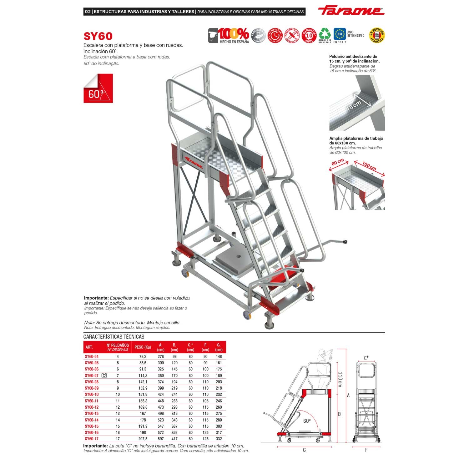 La SY60 es una escalera con ruedas y amplio plano de trabajo antideslizante de 60x100 cm con acceso mediante una escalera de 60º de inclinación con peldaños antideslizantes de 15 cm de profundidad y pasamanos en ambos lados.