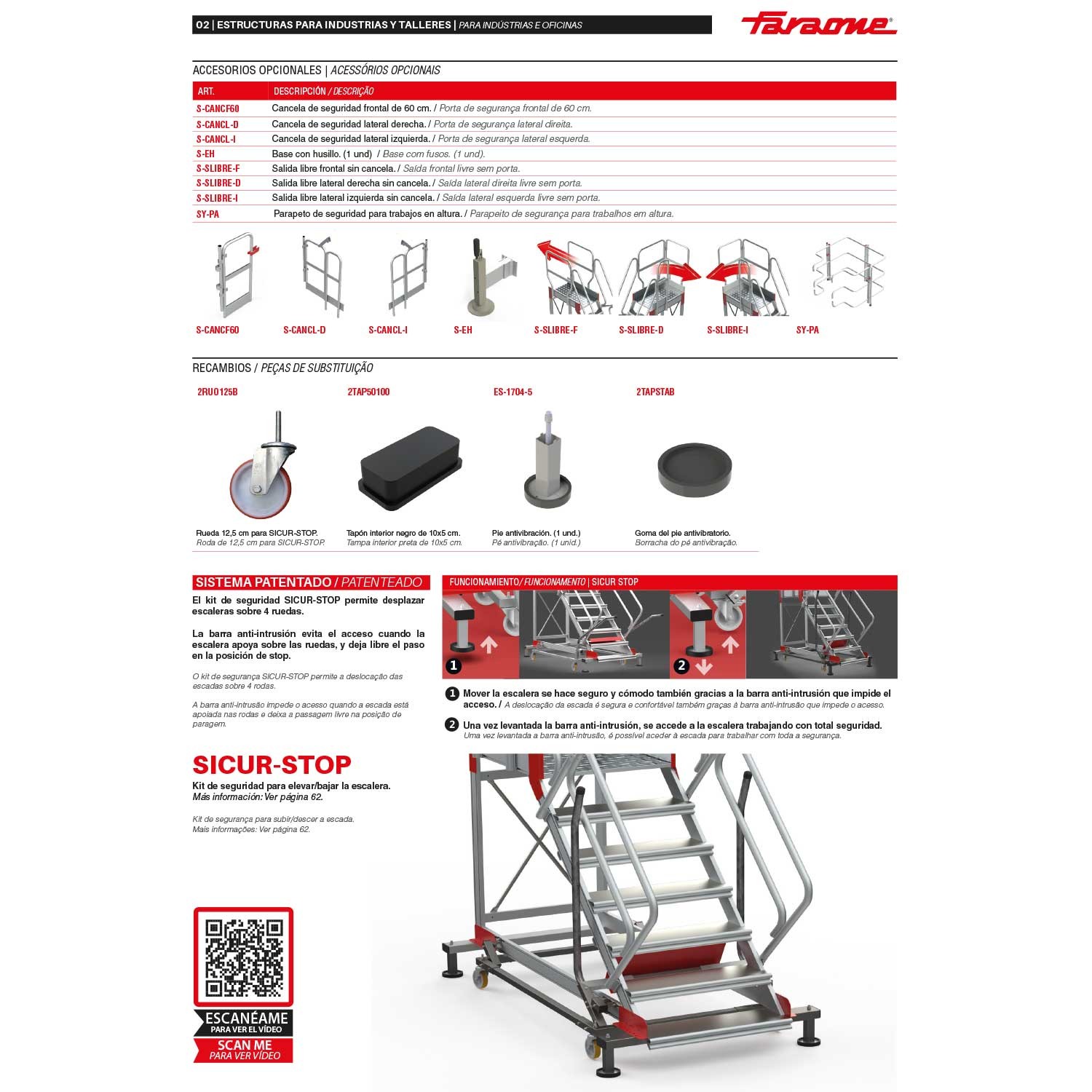 Incluye el sistema patentado SICUR STOP; kit de seguridad que permite desplazar la escalera sobre sus cuatro ruedas. La barra antintrusión evita el acceso cuando la escalera apoya sobre las ruedas y deja libre el paso en la posición de parada “stop”.