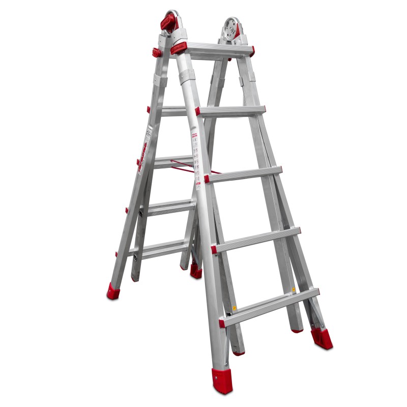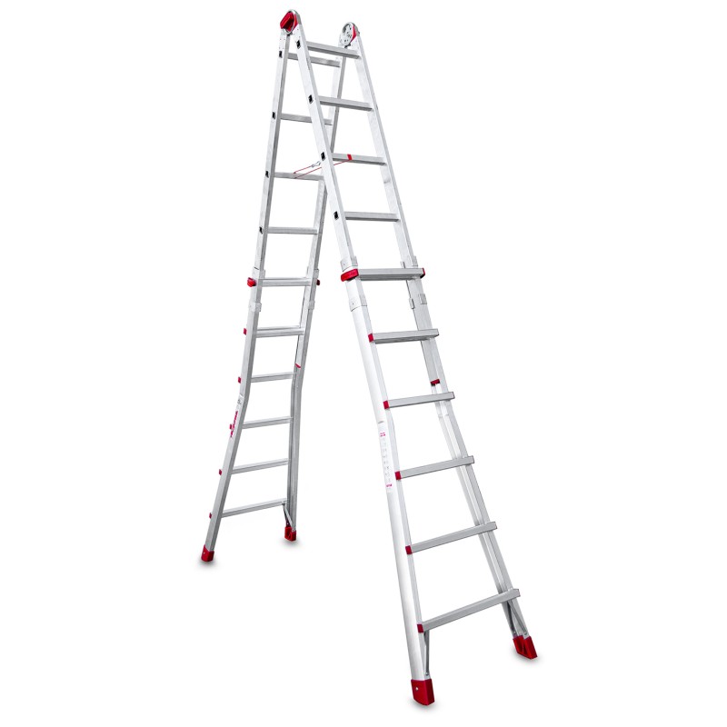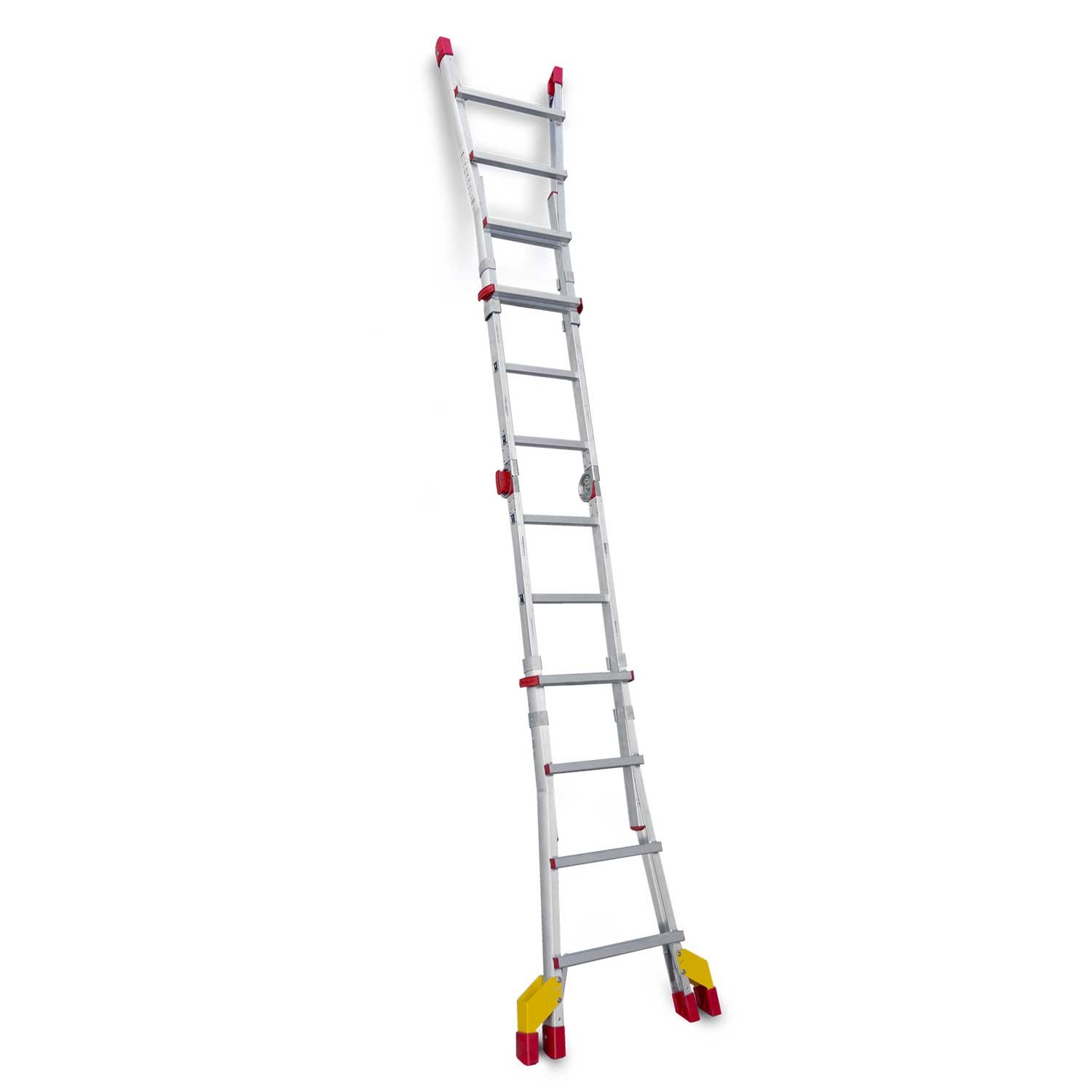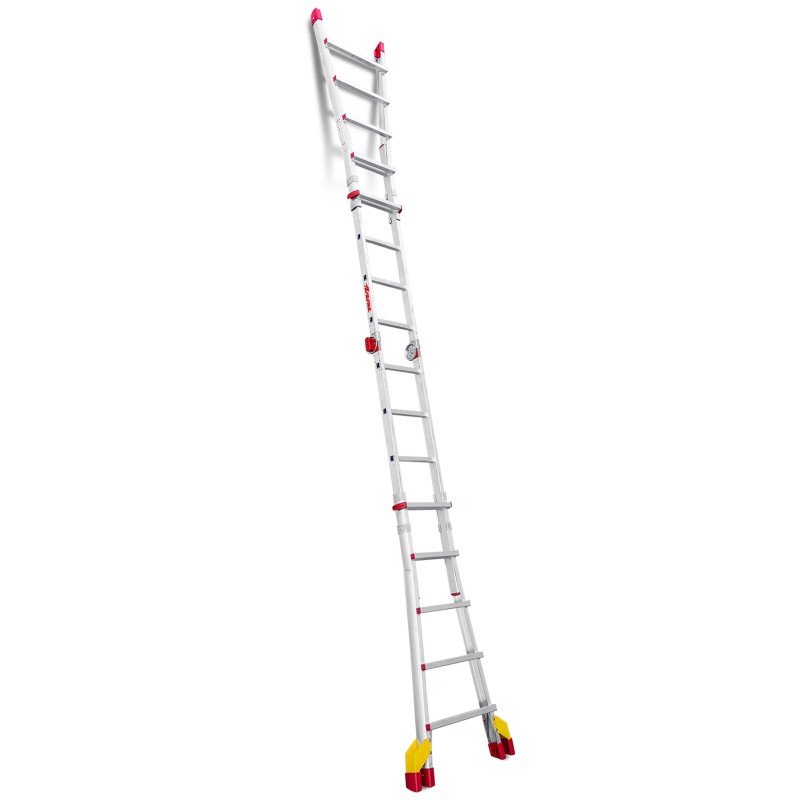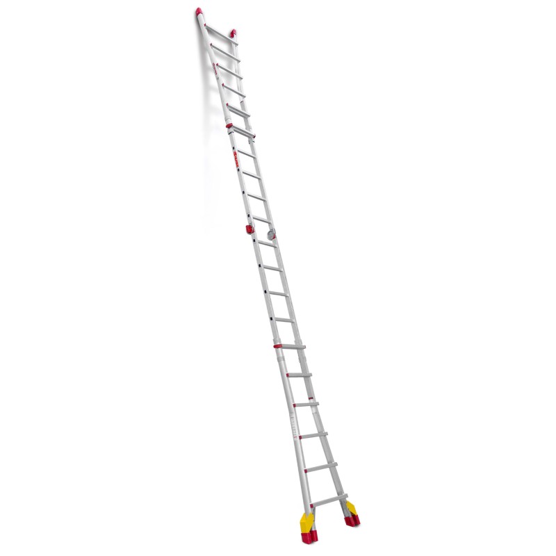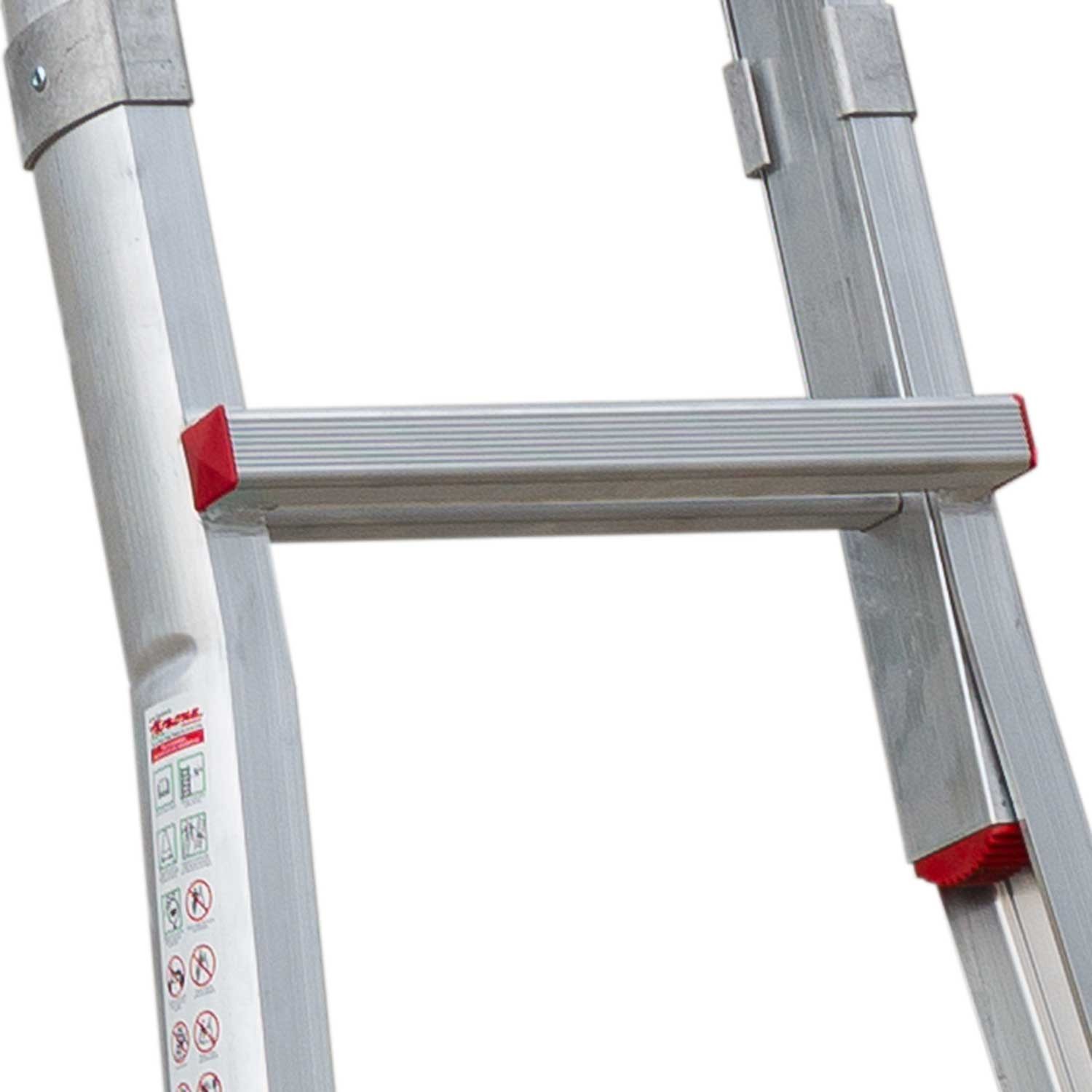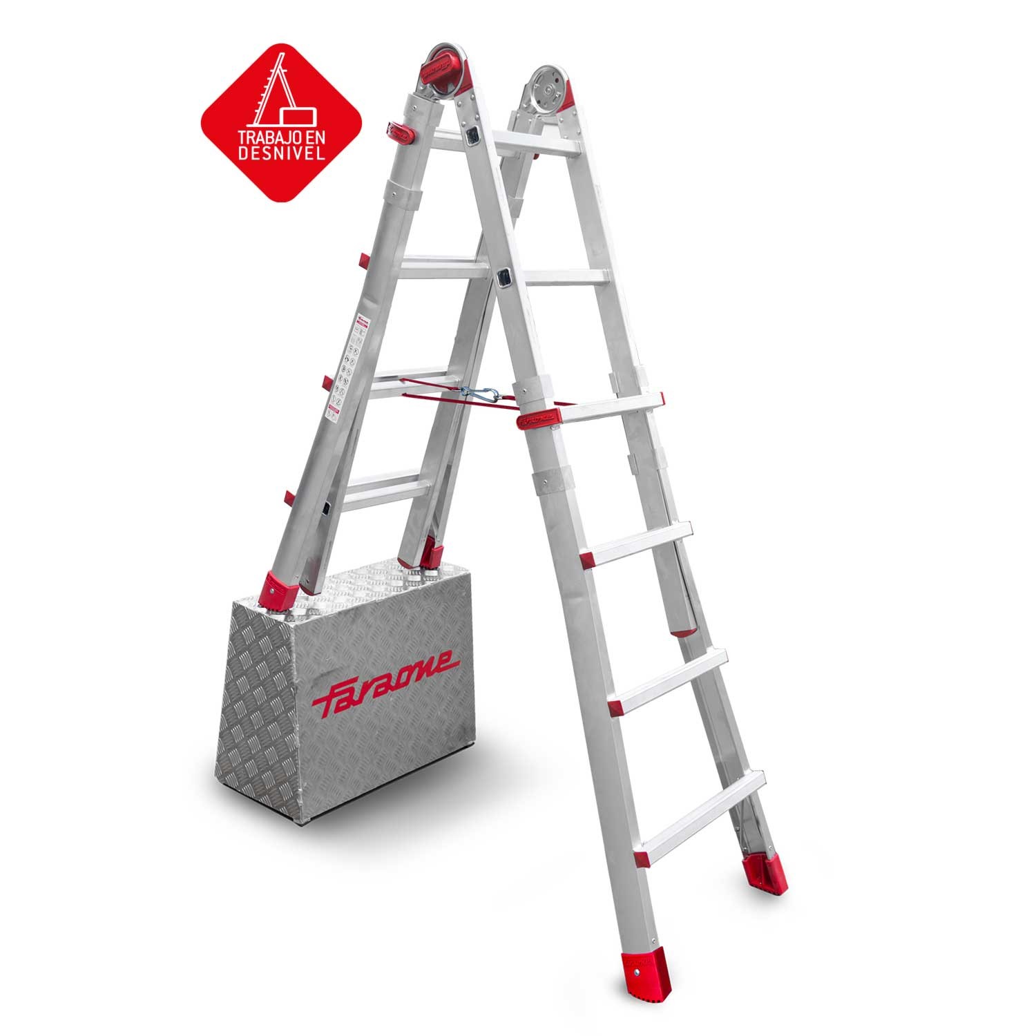 La escalera fabricada en aluminio, con peldaños antideslizantes de 3 cm, altura regulable y tacos de alta adherencia. Incluye de serie sus estabilizadores extraíbles; necesarios para cumplir la normativa con la escalera extendida.