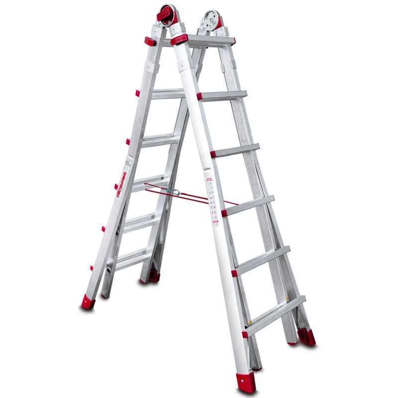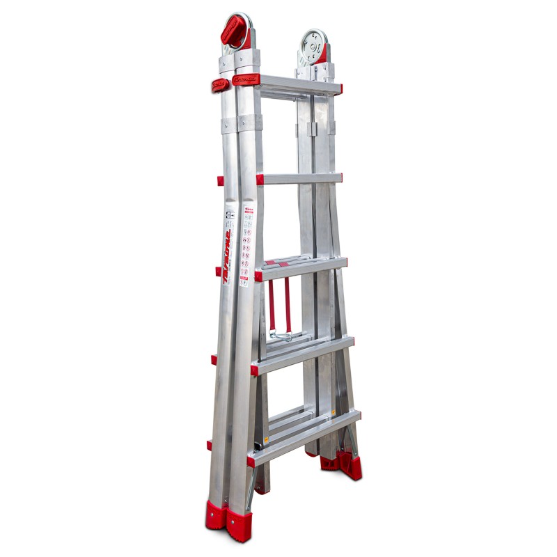 La escalera TELES está fabricada en aluminio, con peldaños antideslizantes de 3 cm, altura regulable y tacos de alta adherencia. Incluye de serie sus estabilizadores extraíbles; necesarios para cumplir la normativa con la escalera extendida.