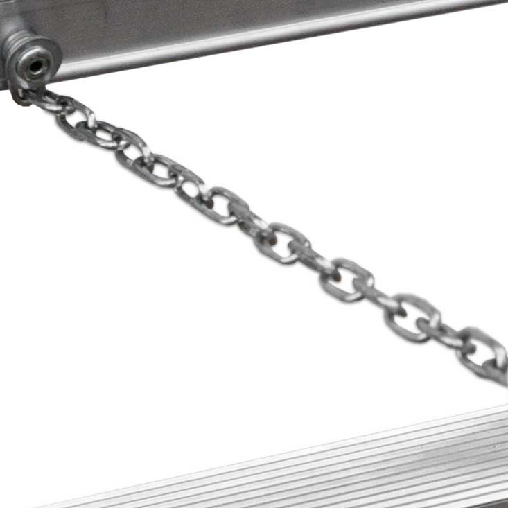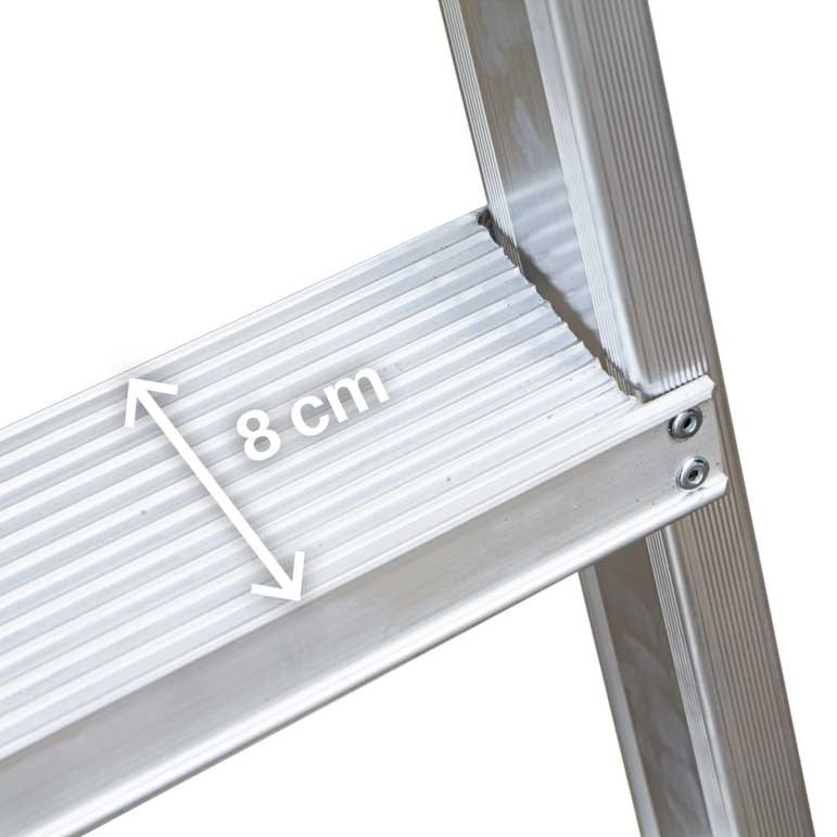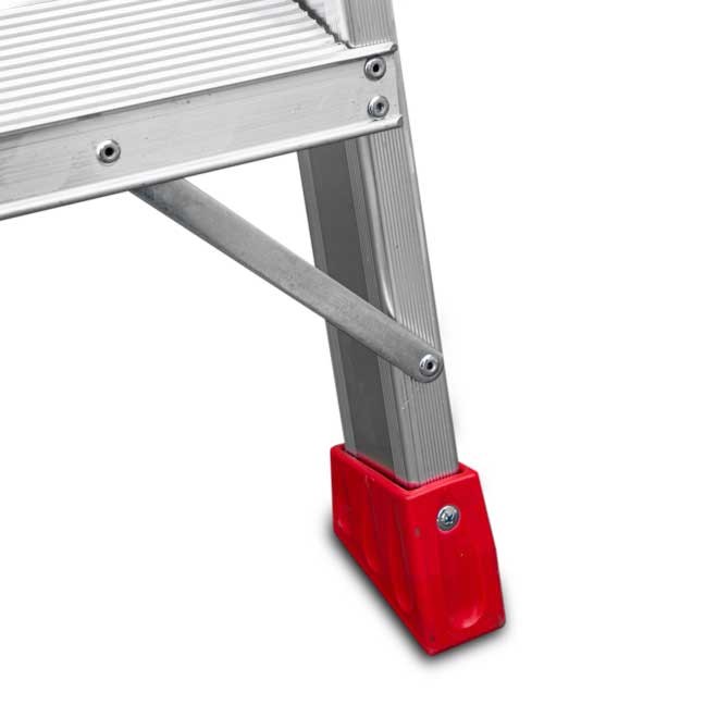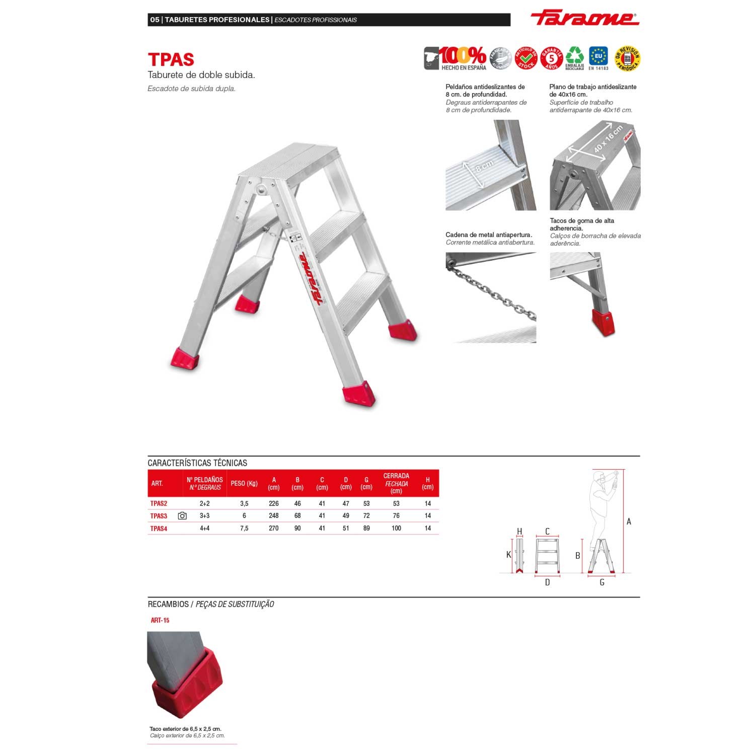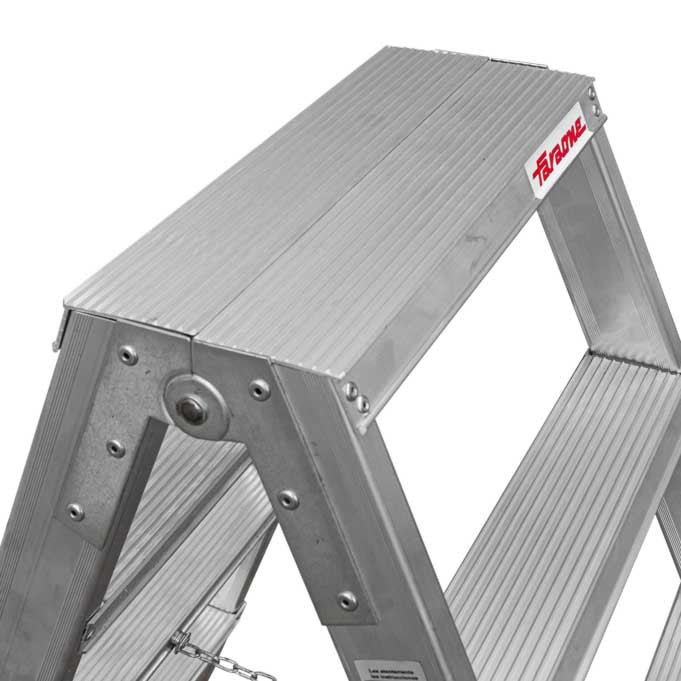 El modelo TPAS está fabricado en aluminio, posee un sistema de bisagras rígido y resistente entre los dos tramos de subida, un sistema anti cierre seguro, peldaños de 8 cm y amplios tacos de goma con gran agarre a la superficie.
